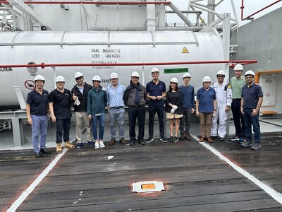 Recently, whilst in Singapore for Board meetings, a group of UK Club Directors and Managers visited the Fortescue Green Pioneer at the Singapore Anchorage. The tour, led by Mr. Andrew Hoare, head of Green Shipping at Fortescue, and supported by the crew, provided an insightful look at this pioneering vessel. The Green Pioneer has become a symbol of innovation and progress in the maritime industry, particularly in the use of ammonia as a ship's fuel. Although still a prototype, it is the first ocean-going ammonia-powered supply vessel.