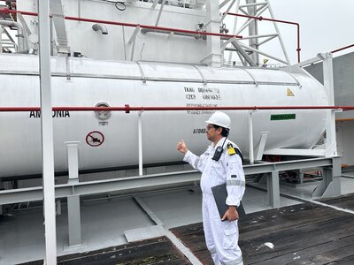 The Green Pioneer is equipped with several advanced systems to ensure the safe and efficient use of ammonia as a fuel. Visitors were immediately struck by the ship’s deck layout, which houses specialised equipment essential for its ammonia-burning capability. At the bunker station, ammonia is loaded onto the vessel with meticulous monitoring due to its highly toxic nature. The Chief Engineer explained that after connecting the bunker hose and performing safety checks, the crew uses a remote panel from the bridge to control the valves. Gauges and sensors continuously monitor pressure, temperature, and flow rates to detect any leaks.